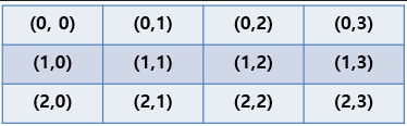 [(0, 0), (0, 1), (0, 2), (0, 3), (1, 0), (1, 1), (1, 2), (1, 3), (2, 0), (2, 1), (2, 2), (2, 3)]