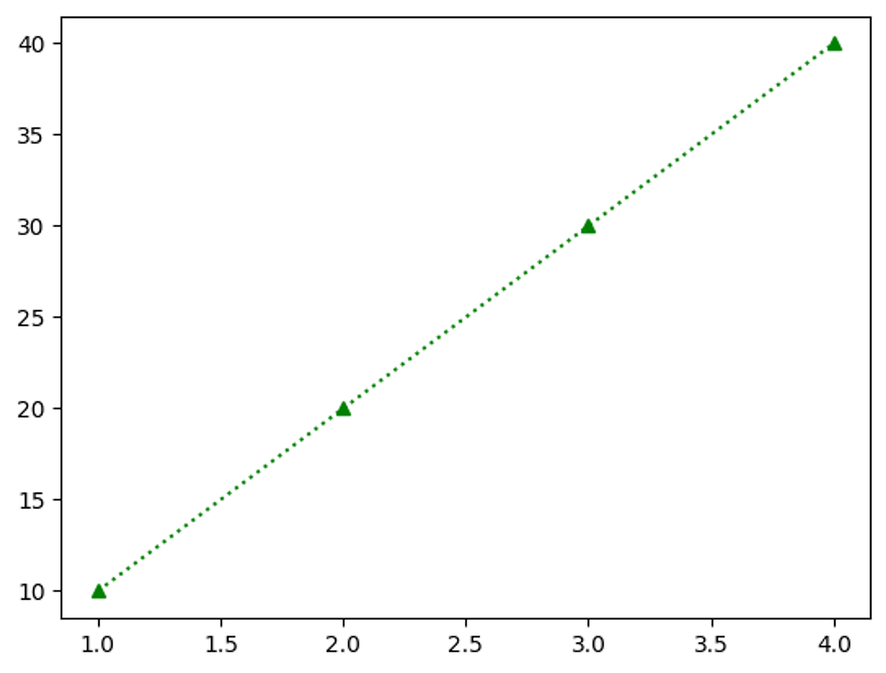 plt.plot([1, 2, 3, 4], [10, 20, 30, 40], 'g^:') # x-축 데이터와 y-축 데이터 모두 전달, x-축 데이터 개수와 y-축 테이터 개수 일치