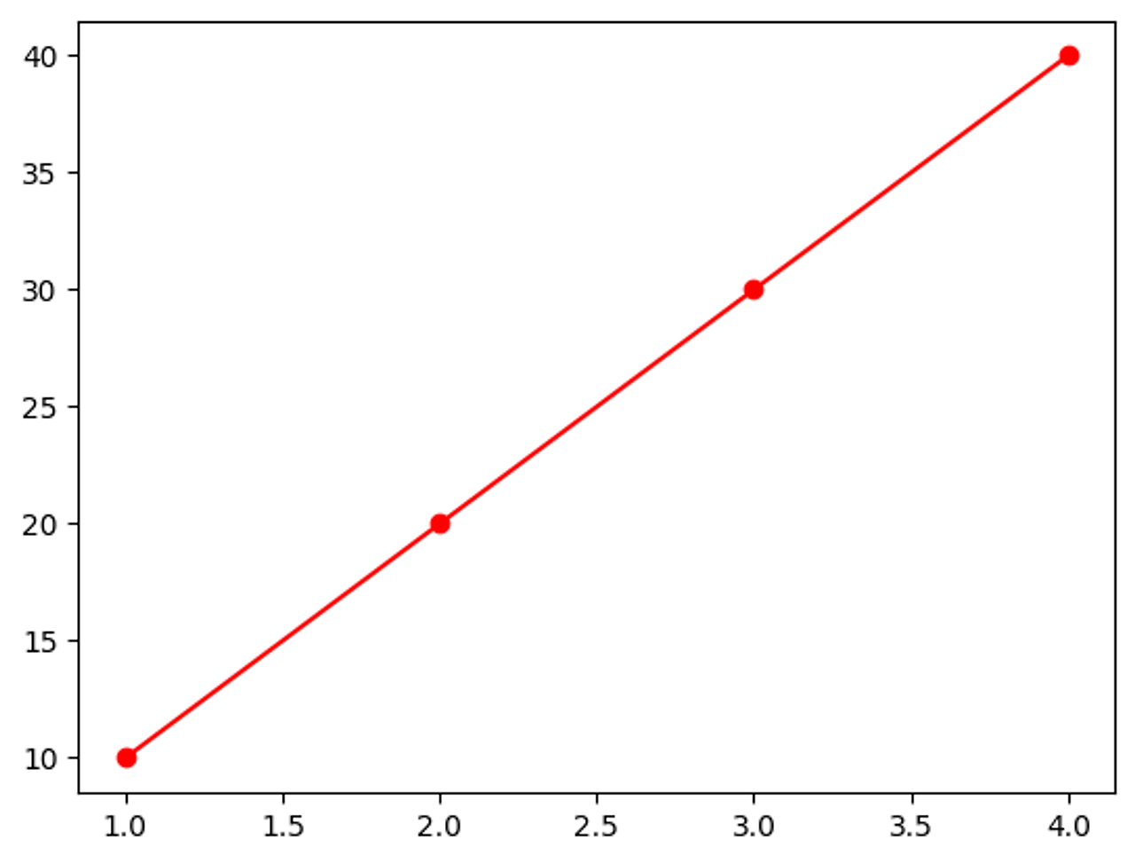 plt.plot([1, 2, 3, 4], [10, 20, 30, 40], 'ro-') # x-축 데이터와 y-축 데이터 모두 전달, x-축 데이터 개수와 y-축 테이터 개수 일치