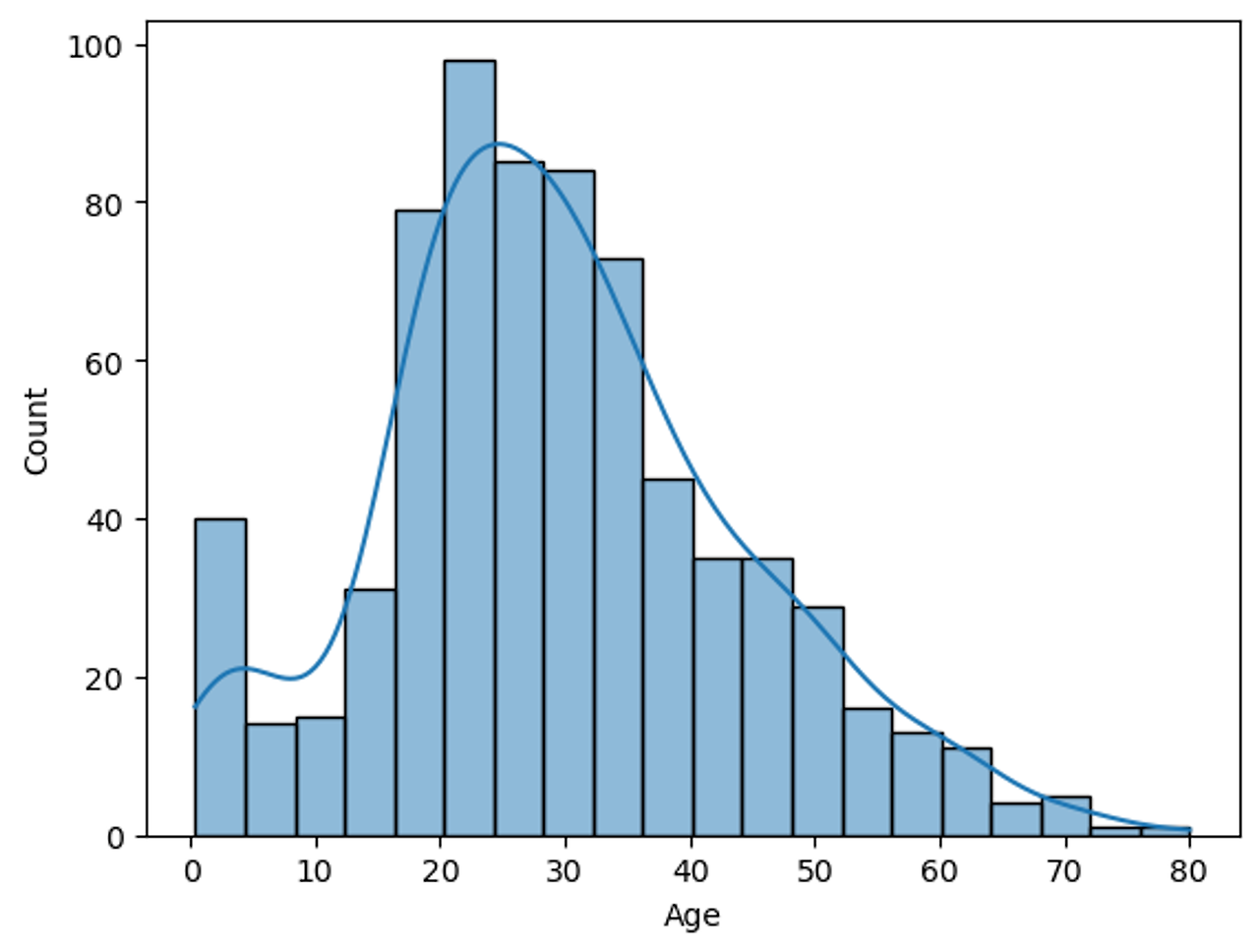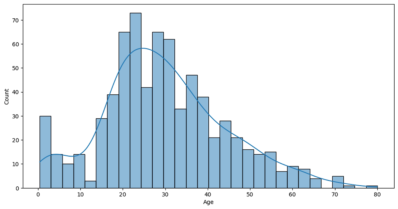 sns.histplot(x='Age', data=titanic_df, kde=True, bins=30)