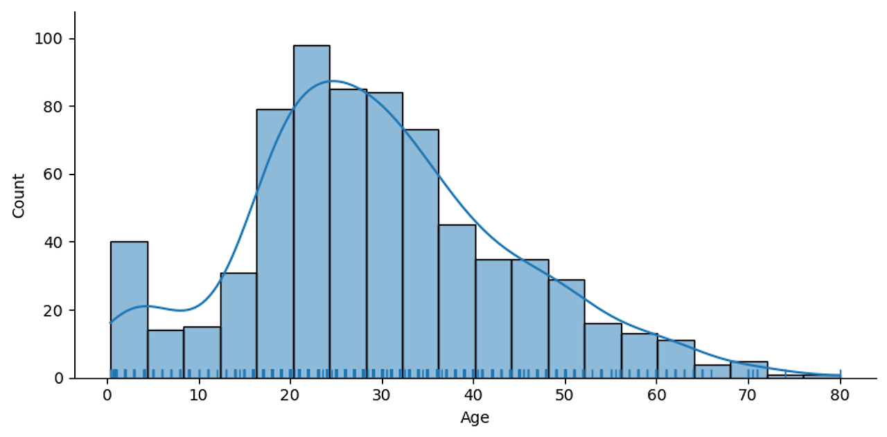 sns.displot(titanic_df['Age'], kde=True, rug=True, height=4, aspect=2)