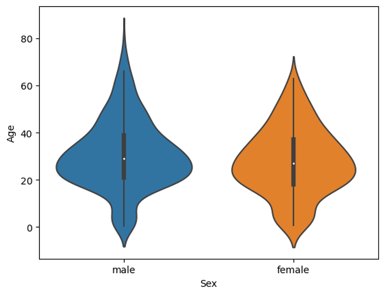 # x축인 Sex값 별로 y축값이 Age의 값 분포를 알 수 있음.