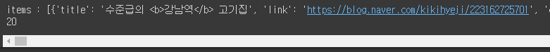 url = '<https://openapi.naver.com/v1/search/blog?query=강남역&display=20&start=1&sort=sim>' result = requests.get(url, headers=headers) information = result.json() information