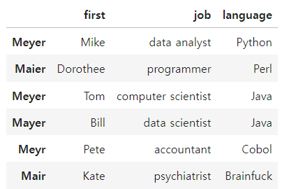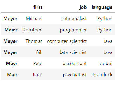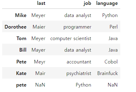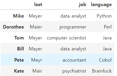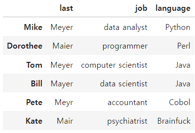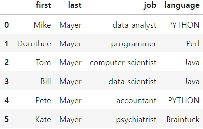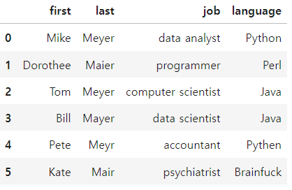 df = pd.DataFrame(list(zip(first, last, job, language)),