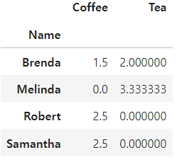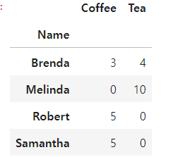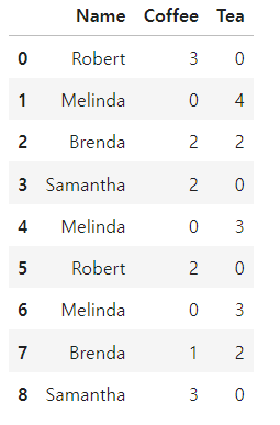 beverages = pd.DataFrame({'Name': ['Robert', 'Melinda', 'Brenda',