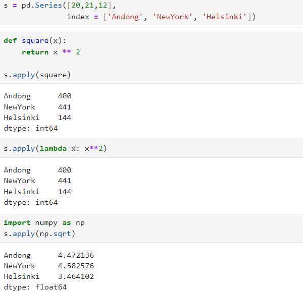 - Series.apply(func, convert_dtype=True, args = (), **kwarrgs)