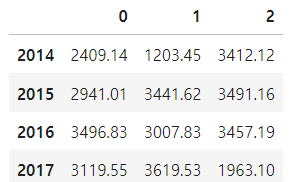 2014 2409.14 2015 2941.01 2016 3496.83 2017 3119.55 2014 1203.45 2015 3441.62 2016 3007.83 2017 3619.53 2014 3412.12 2015 3491.16 2016 3457.19 2017 1963.10 dtype: float64