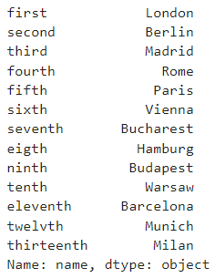 Index(['bananas', 'cherries', 'oranges', 'apples', 'cherries', 'bananas', 'pears', 'clementines', 'cherries', 'pears', 'bananas', 'clementines', 'apples', 'cherries', 'apples', 'clementines', 'cherries', 'pears', 'apples', 'apples', 'oranges', 'apples', 'clementines', 'pears', 'clementines', 'oranges', 'oranges', 'bananas', 'clementines', 'oranges'], dtype='object')