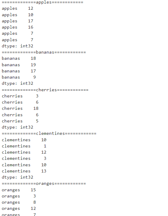 apples 400 oranges 1089 cherries 2704 pears 100 dtype: int64