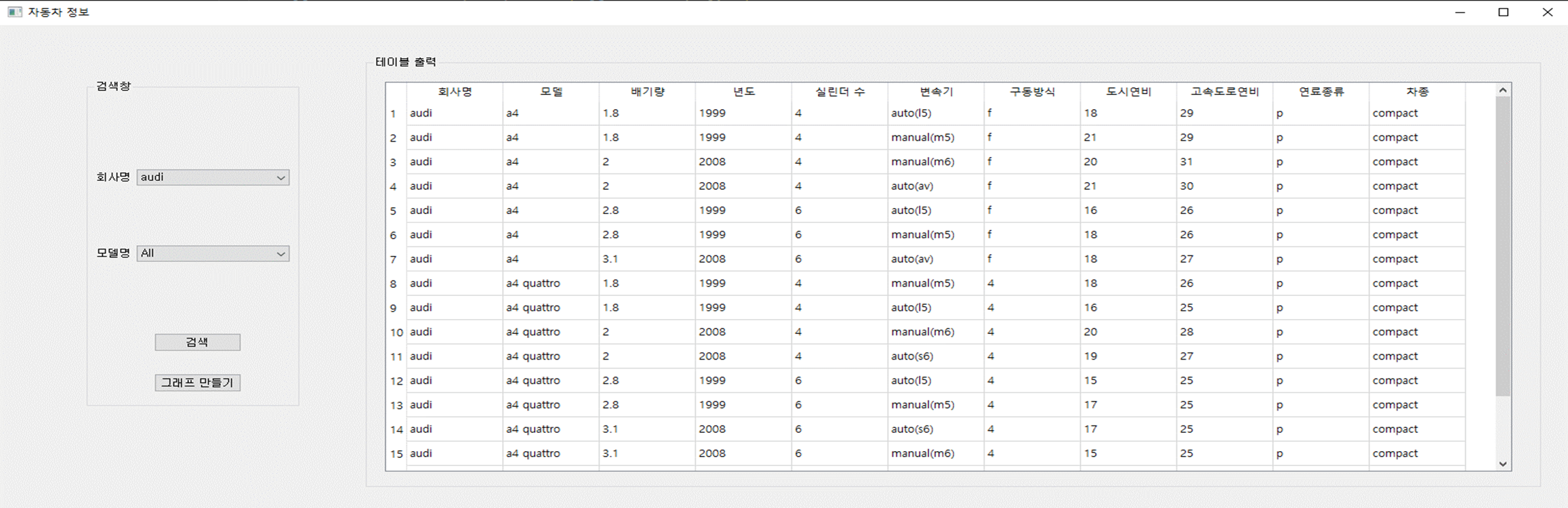 header = ['회사명','모델','배기량','년도', '실린더 수','변속기','구동방식', '도시연비', '고속도로연비', '연료종류', '차종']