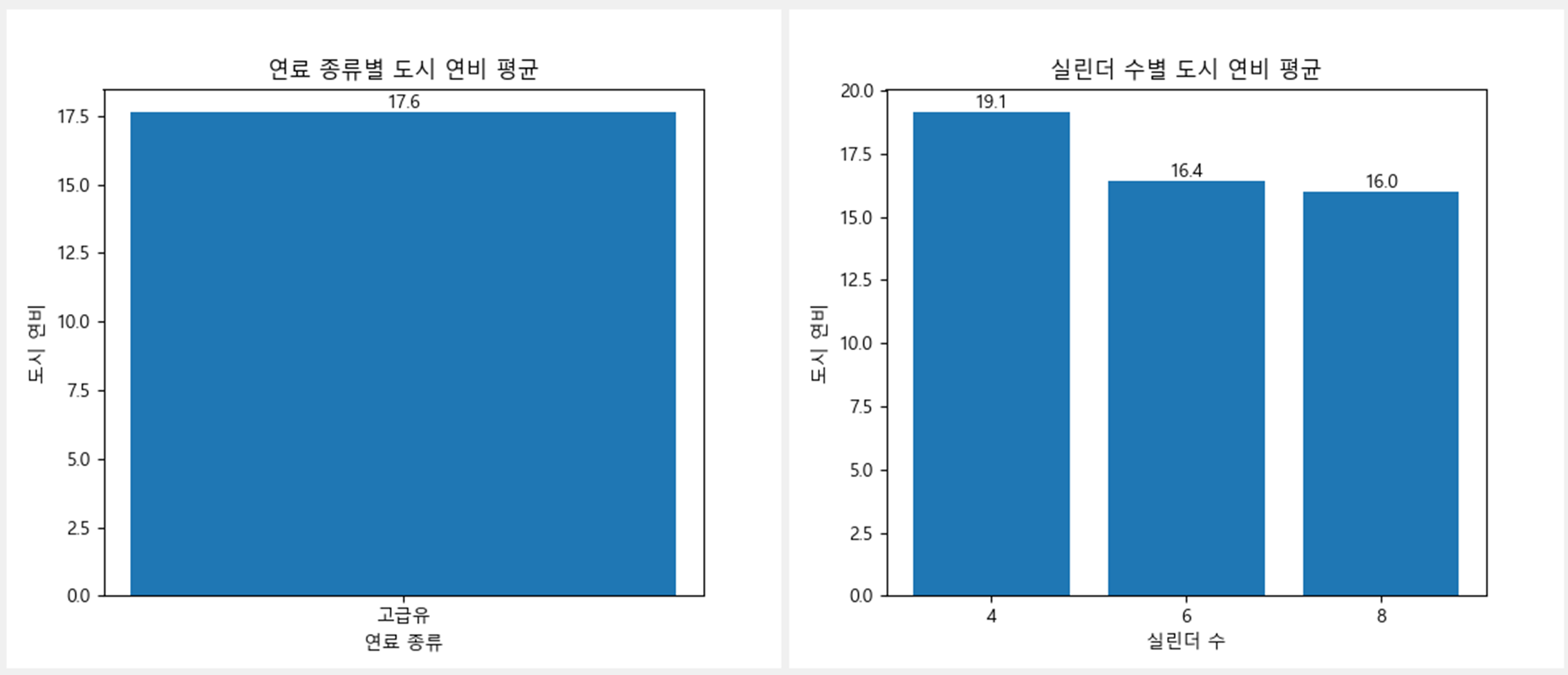 self.create_graph(ax1, '연료 종류별 도시 연비 평균', '연료 종류', '도시 연비', 9, 7)