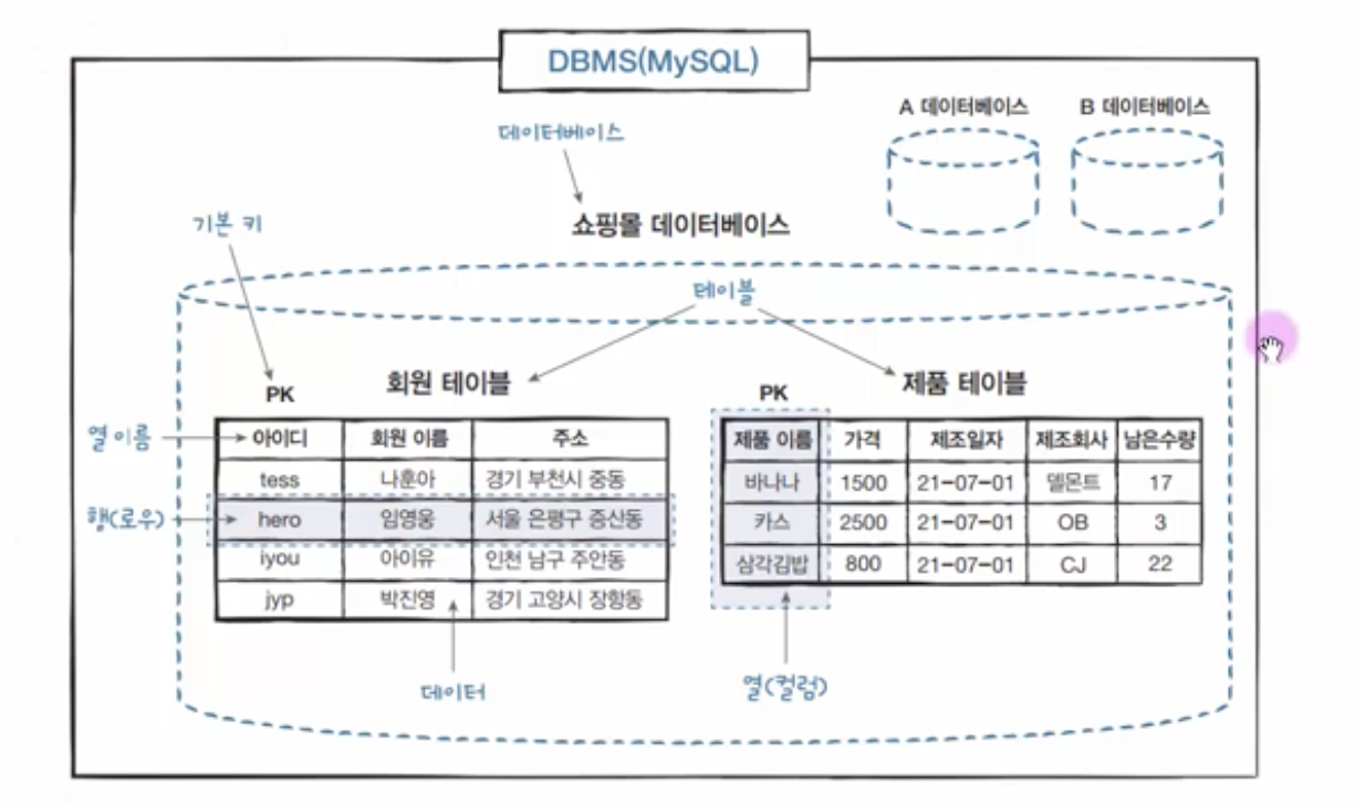 - EX) 회원 정보 테이블, 제품 정보 테이블