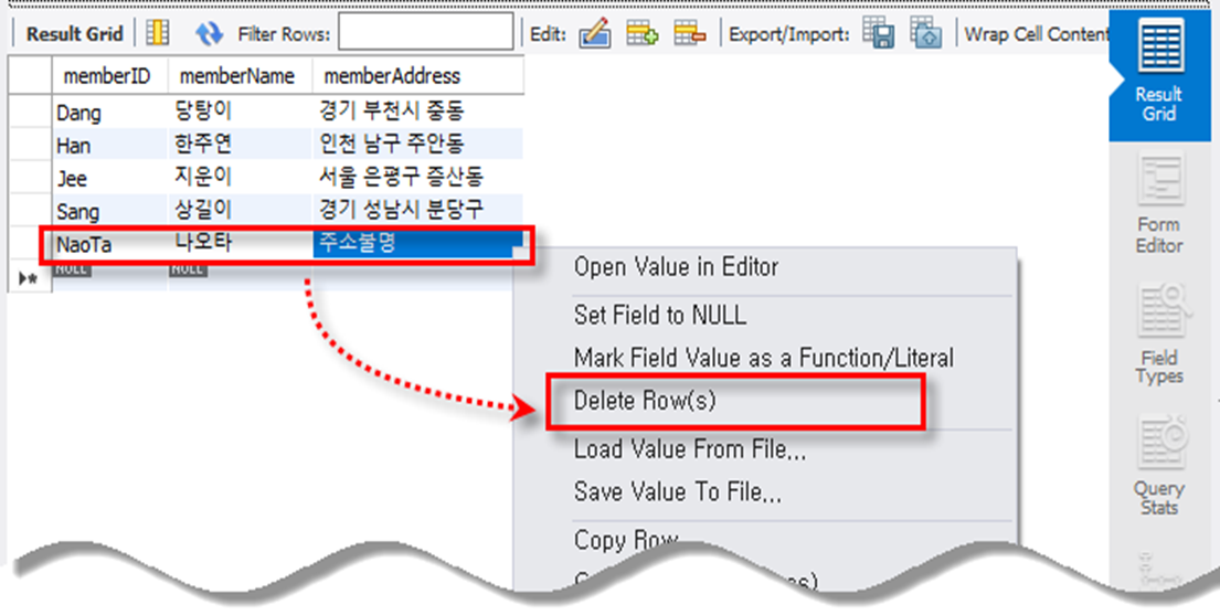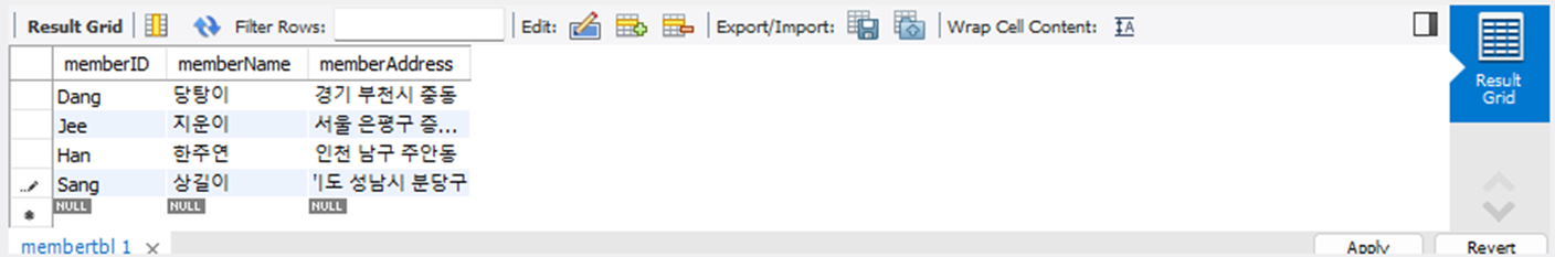 - [Navigator]/[shopdb]/[Tables]/[membertbl]을 마우스 우클릭 - “Select Rows – Limits 1000”을 선택