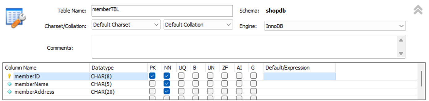 - 테이블을 생성할 때 열 이름과 함께 지정