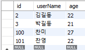 INSERT INTO testTbl2 VALUES (NULL, '찬영', 22);