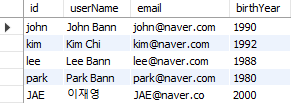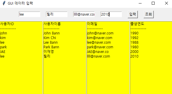 cur.execute("INSERT INTO userTable VALUES('lee','Lee Bann', 'lee@naver.com', 1988)")