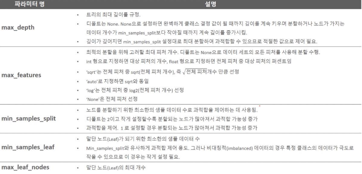 print('DecisionTreeClassifier 기본 하이퍼 파라미터:\\n', dt_clf.get_params())
