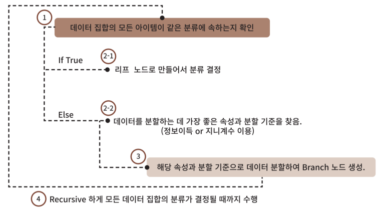 - 데이터가 모두 특정 분류에 속하게 되면 분할을 멈추고 분류 결정