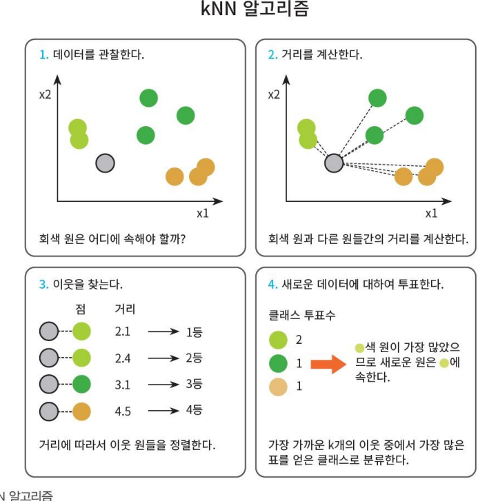 - k-Nearest Neighbor(KNN) 알고리즘은 모든 기계 학습 알고리즘 중에서도 가장 간단하고 이해하기 쉬운 분류 알고리