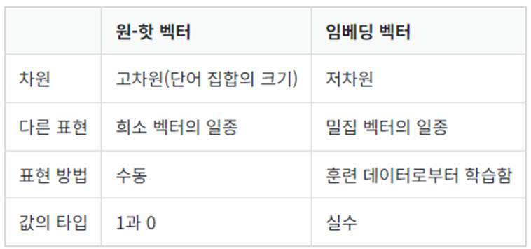 - 희소 벡터를 생성하는 원-핫 인코딩의 문제는 전체 데이터에서 단어의 개수가 늘어나면 벡터의 차원이 한 없이 증가