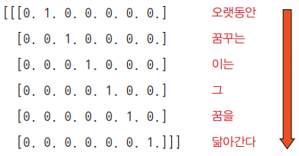 - 원-핫 인코딩은 표현하고자 하는 단어에 해당 하는 위치 값만 ‘핫(1)’이고 나머지는 0인 형태의 벡터를 생성