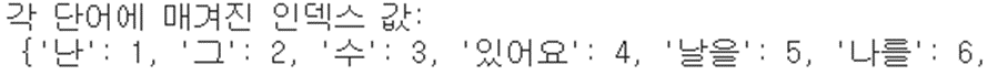 print('각 단어에 매겨진 인덱스 값:\n', token.word_index)
