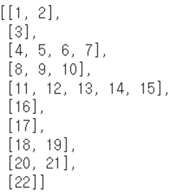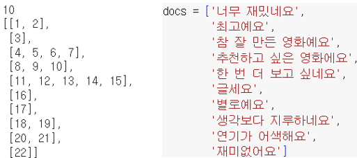 x = token.texts_to_sequences(['보고 싶은', '너무 너무 최고예요']) # 토큰(단어)의 인텍스를 요소로 하는 배열을 생성