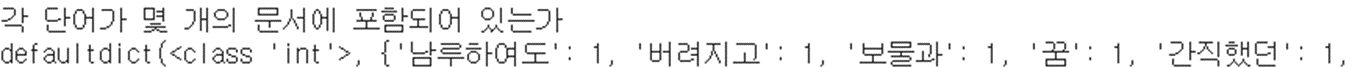 print('각 단어가 몇 개의 문서에 포함되어 있는가')