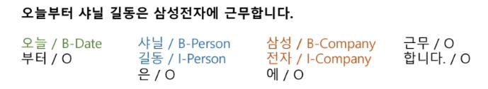 - B-개체명이 시작되는 단어 B-개체명, I는 B-개체명과 연결되는 단어일때 I-개체명, O는 개체명 이외의 모든 토큰
