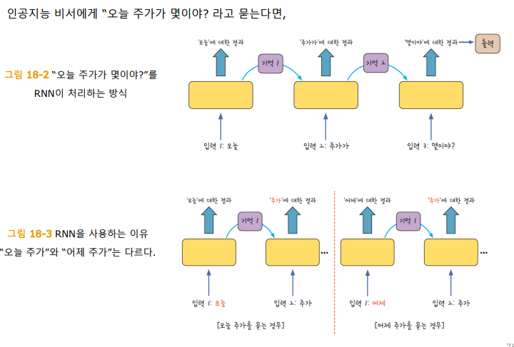 - LSTM(Long Short Term Memory) ,RNN은 시계열 데이터 처리에 특화되어 은닉층에서 과거의 정보를 기억