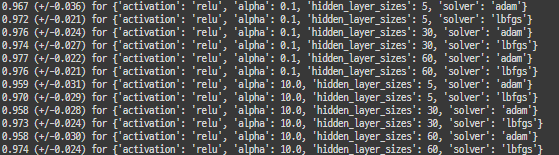 for mean, std, params in zip(means, stds, GS_NN.cv_results_['params']):
