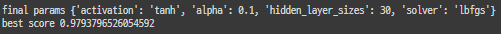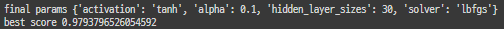 parameters3={'alpha':[1e-1],'hidden_layer_sizes':[(30,2),(30,5)],'activation':['tanh'],'solver':['adam']}