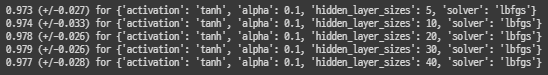 parameters={'alpha':[1e-3,1e-1,1e1],'hidden_layer_sizes':[(5),(30),(60)],'activation':['tanh','relu'],'solver':['adam','lbfgs']}