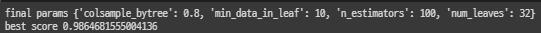 # lightGBM에서 주로 고려해야할 num_leaves, min_data_in_leaf, colsample_bytree, n_estimators 등을 고려하여 Grid search를 수행합니다.