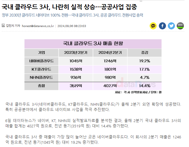 올해 2분기 국내 클라우드 3사가 매출 성장을 이룬 것은 매우 긍정적인 소식이다. 특히 공공 분야에서의 클라우드 네이티브 사업 추진이 주목할 만하다.