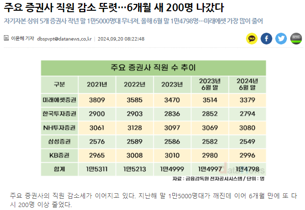 최근 주요 증권사의 직원 감소세가 이어지고 있다는 소식은 매우 걱정스럽습니다. 제가 데이터 분석가로서 이 분야에 진출하고 싶어 하는 만큼, 이러한 상황이 제 진로에 어떤 영향을 미칠지 고민하게 됩니다.