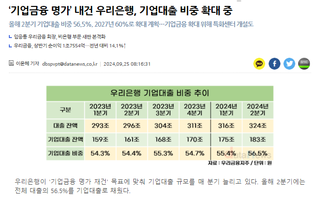 우리은행이 '기업금융 명가 재건' 목표에 맞춰 기업대출 규모를 매 분기 늘리고 있다는 소식은 매우 긍정적입니다. 이러한 정보는 금융권에 취업하고자 하는 저에게 면접이나 자기소개서에서 유용하게 활용될 것이라고 생각합니다.