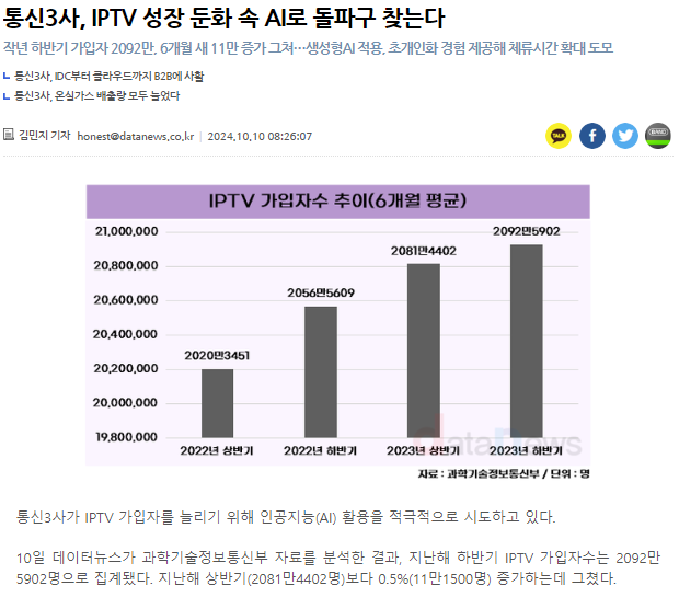 통신3사가 IPTV 가입자를 늘리기 위해 인공지능(AI) 활용을 적극적으로 시도하고 있다는 소식은 매우 고무적입니다. AI의 활용도가 높아짐에 따라 데이터의 중요성도 함께 증가하고 있다는 점에서 이 변화는 주목할 만합니다.