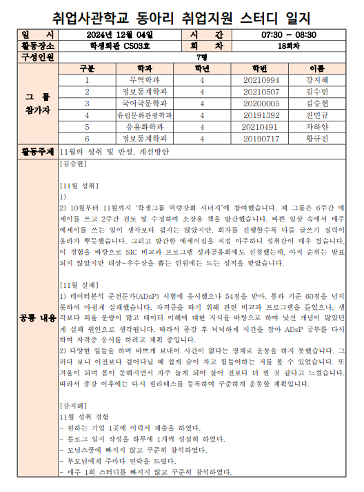 | 직무스터디 20일차 ( 2024.12.18 07:30~08:30 ) (1) | 2024.12.18 |