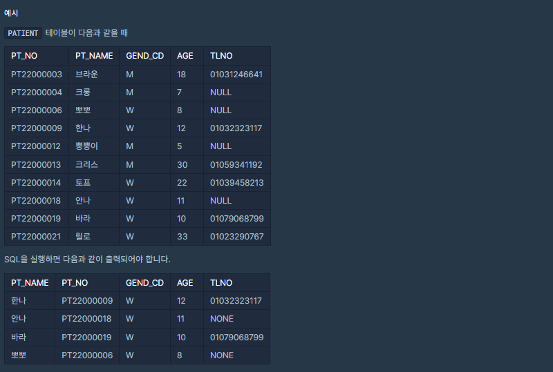 SELECT PT_NAME, PT_NO, GEND_CD, AGE, IFNULL(TLNO,'NONE') AS TLNO