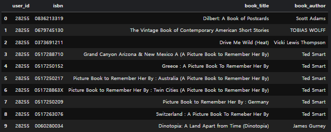 return predictions[['user_id', 'isbn', 'book_title', 'book_author']]