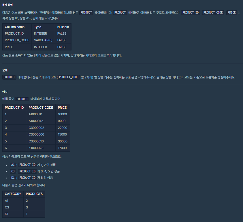 SELECT LEFT(PRODUCT_CODE, 2) AS CATEGORY , COUNT(PRODUCT_ID) AS PRODUCTS