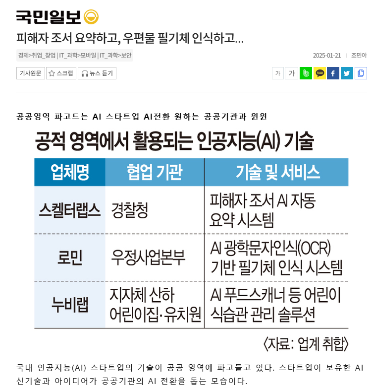 E (Example): 예를 들어, 스켈터랩스의 피해자 조서 AI 요약 기술은 경찰청의 조서 작성 과정을 간소화하여 수사관들이 더 중요한 업무에 집중할 수 있도록 도와줍니다.