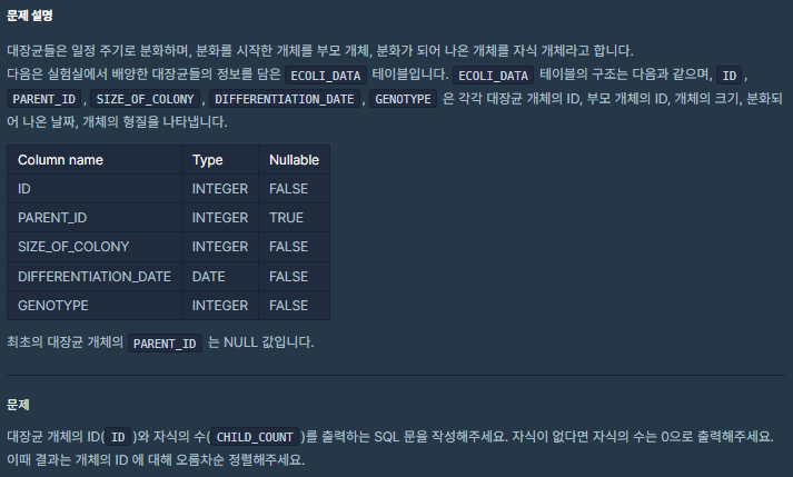 FROM ECOLI_DATA a LEFT JOIN ECOLI_DATA b ON a.ID = b.PARENT_ID