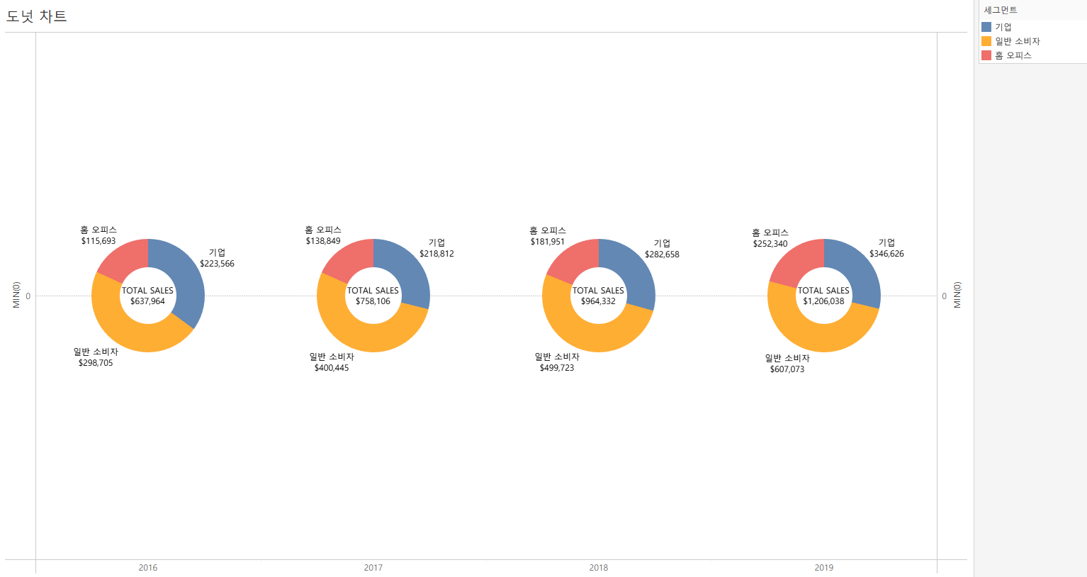 - 2016년부터 2019년까지 연도별 슈퍼스토어의 고객세그먼트별 매출 비중