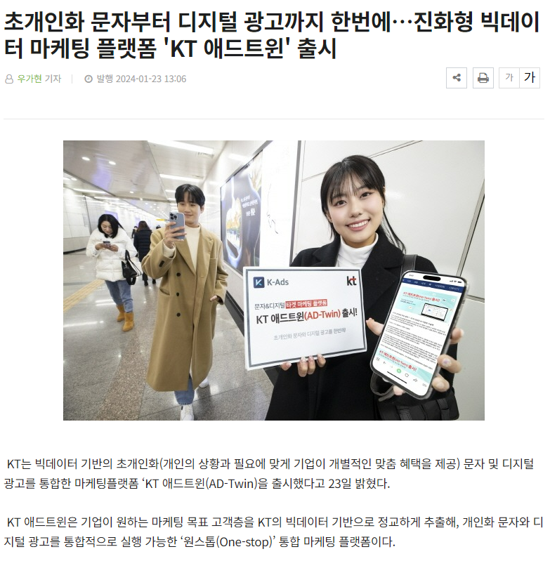 KT는 빅데이터 기반의 초개인화(개인의 상황과 필요에 맞게 기업이 개별적인 맞춤 혜택을 제공) 문자 및 디지털 광고를 통합한 마케팅플랫폼 ‘KT 애드트윈(AD-Twin)을 출시했다고 23일 밝혔다. KT
