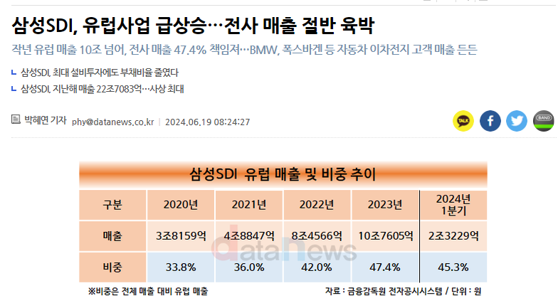 삼성SDI의 유럽 실적이 매년 빠르게 상승해 전사 매출에서 차지하는 비중이 절반에 육박한 것으로 나타났다.19일 데이터뉴스가 금융감독원 전자공시시스템에 공시된 삼성SDI의 분기보고서를 분